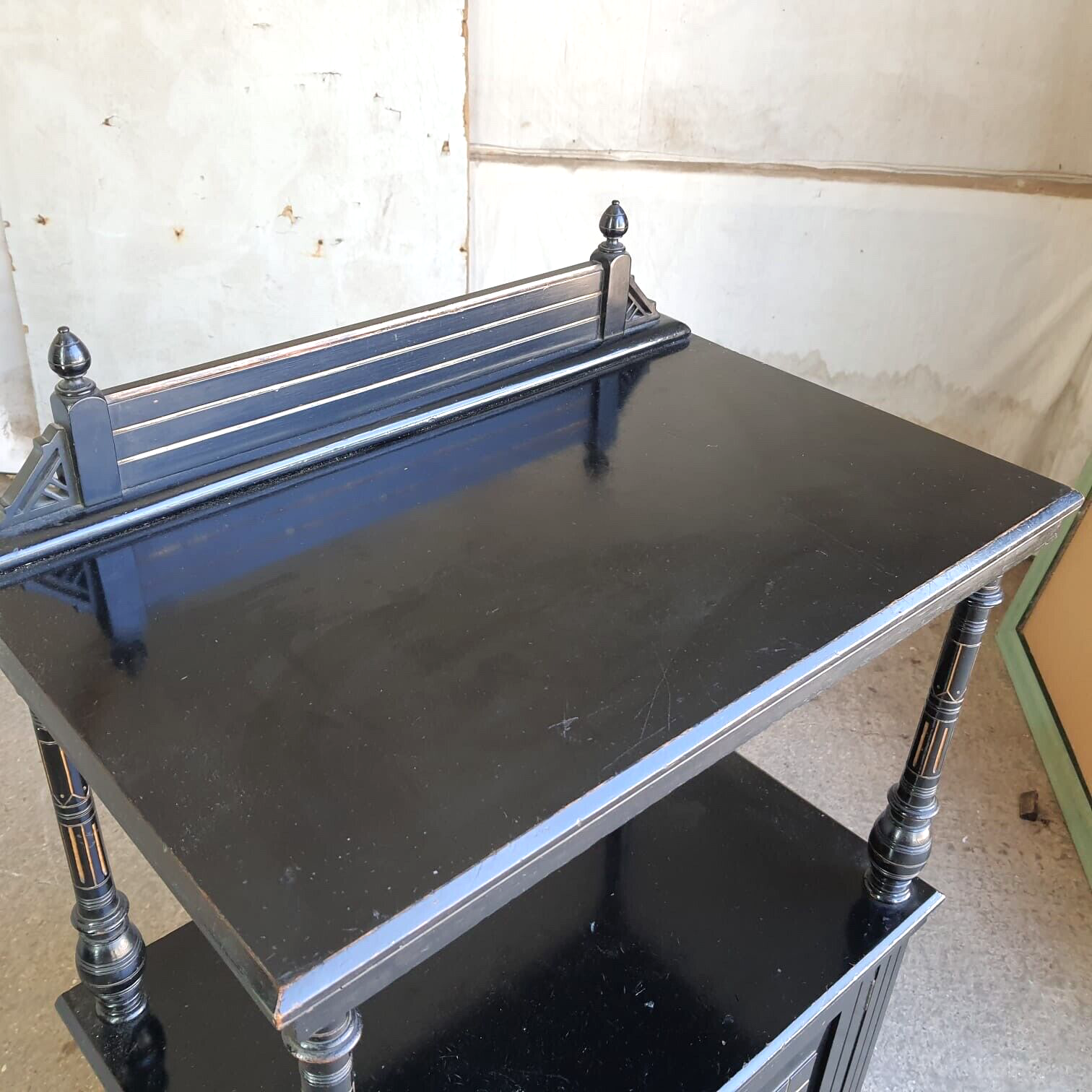 Antique 2 Tier Ebonised Victorian One Door Cabinet Shelves Turned Legs Castors