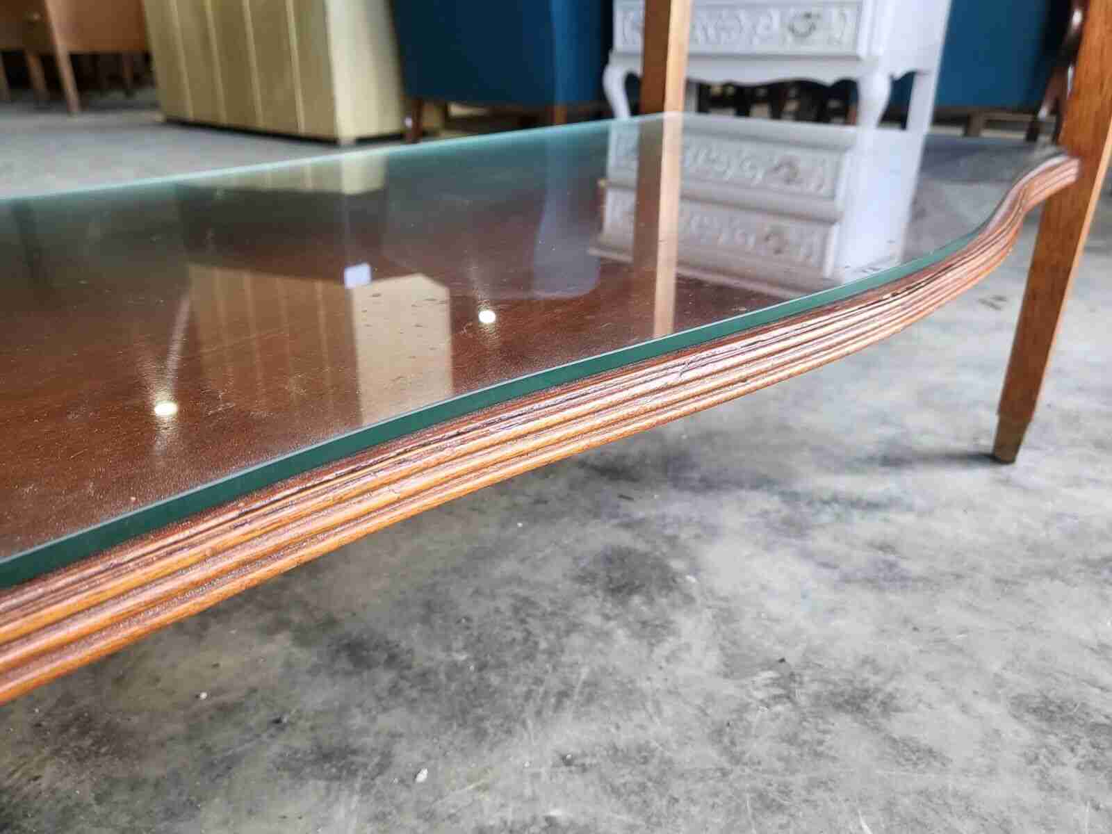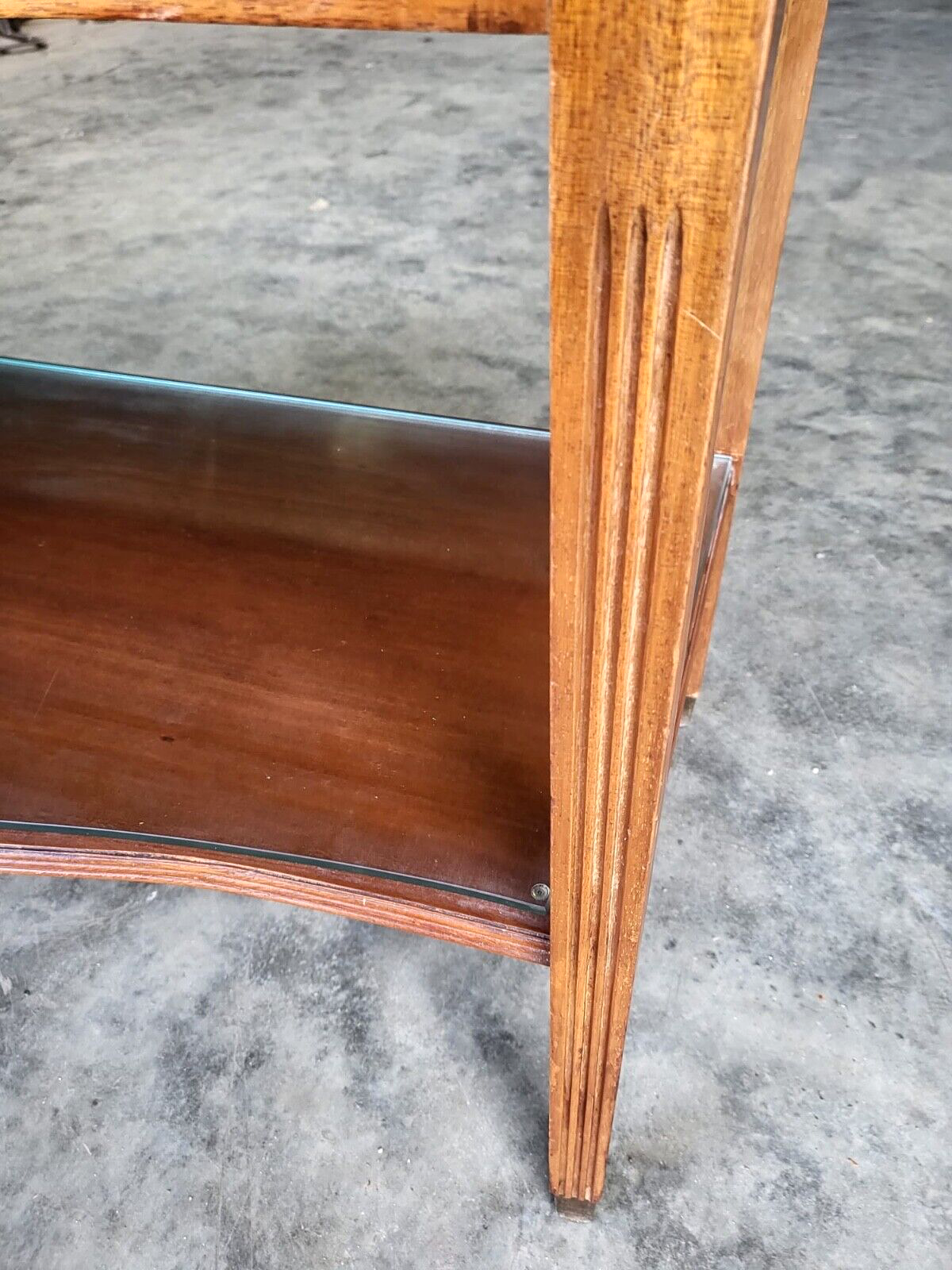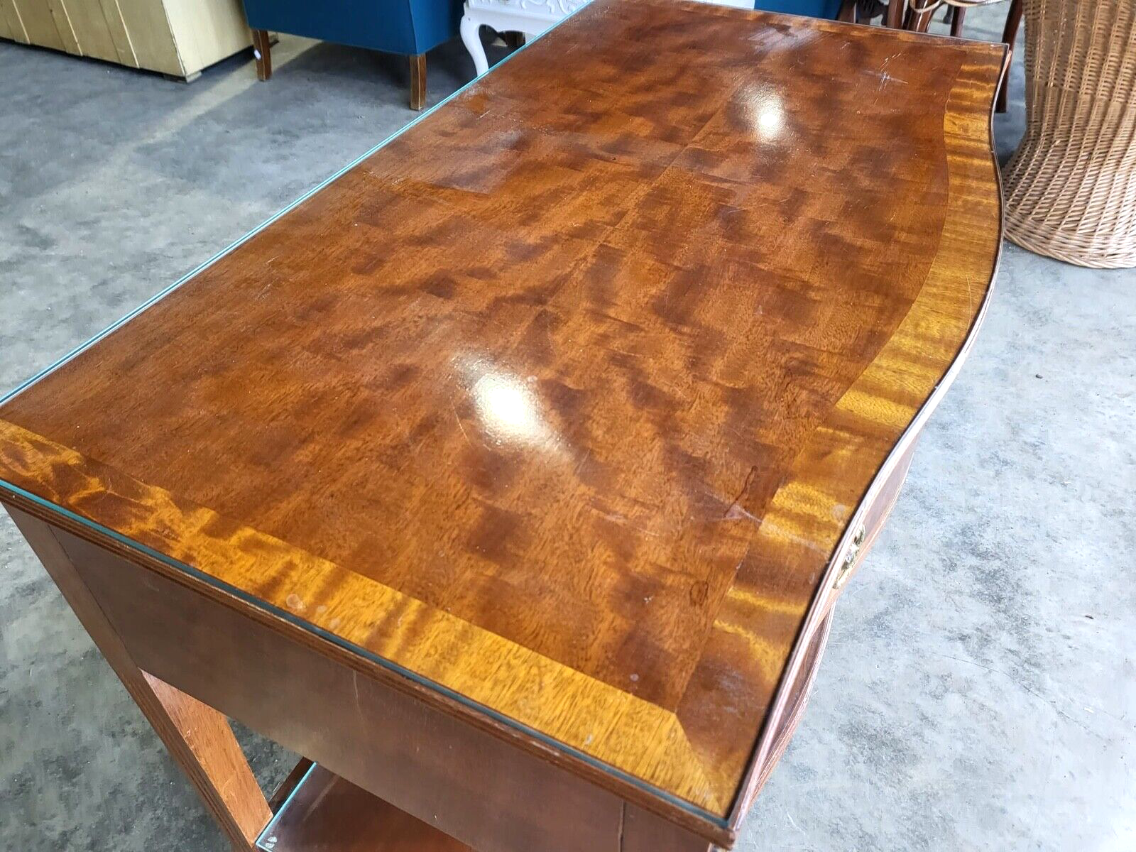 Antique repro French inlaid 2 tier serpentine sideboard / server with cutlery drawers and square legs.